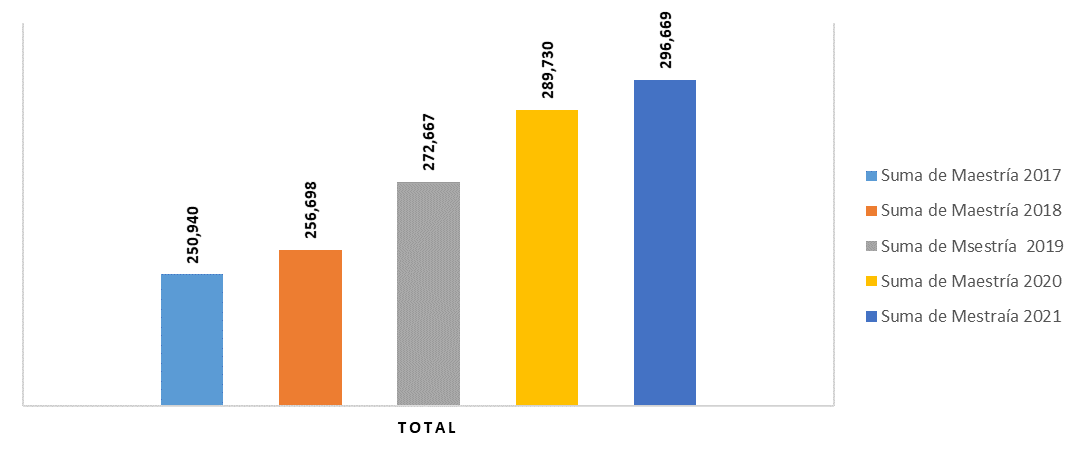 Como se observa, en la gráfica 3, la matrícula a nivel maestría del periodo del 2017-2021 ha ido aumentando; en el 2017, se contaba con una matrícula a nivel federal de 250,940 matriculados, en el 2018, aumento de 5,758 matriculados, y en el 2019, aumento a 15,969, cabe destacar que en el 2019, por consecuencia del COVID-19 se esperaba una disminución en la matrícula, pero fue lo contrario ya que aumentó a 17,063 y no se diga en el 2021 en el que se retomaron paulatinamente las actividades y clases presenciales y hubo un aumento significativo de 6,939 matriculados.