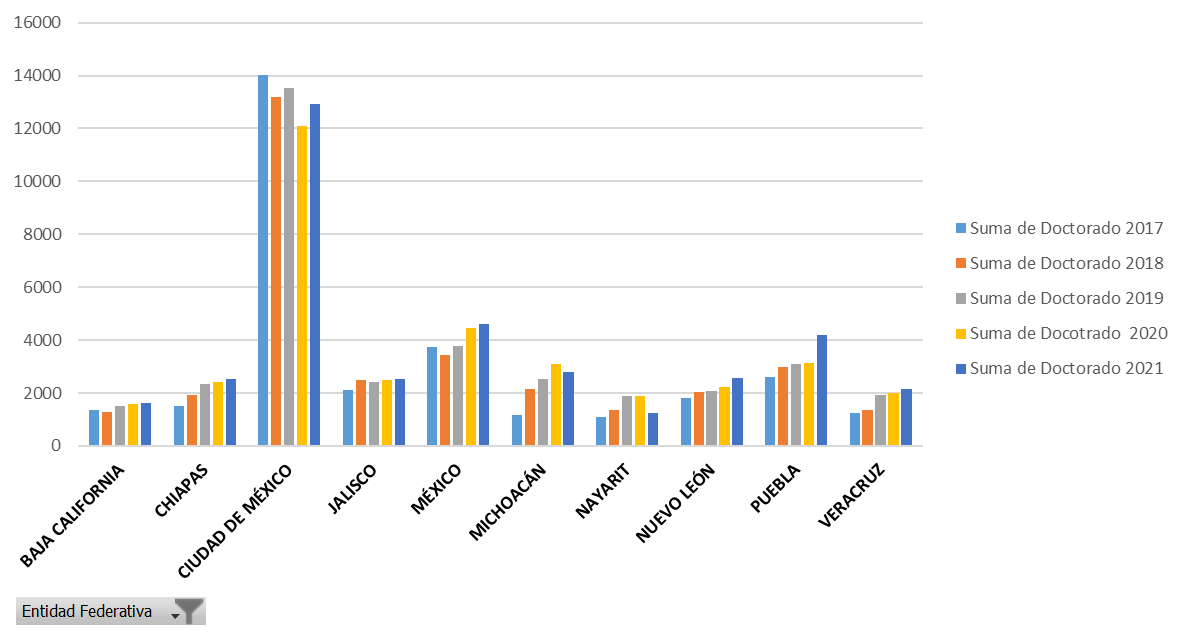 En la gráfica 6 se presenta un concentrado de las 10 entidades federativas con mayor número de matrícula a nivel Doctorado del periodo del 2017-2021, teniendo como resultado lo siguiente: