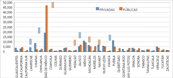 En las instituciones públicas, se tiene en cuenta que la Ciudad de México se encuentra en primer lugar y posteriormente México, y Jalisco en tercer lugar. La particularidad de tres estados como: Michoacán, Morelos, Nuevo León y Puebla están en el cuarto lugar.