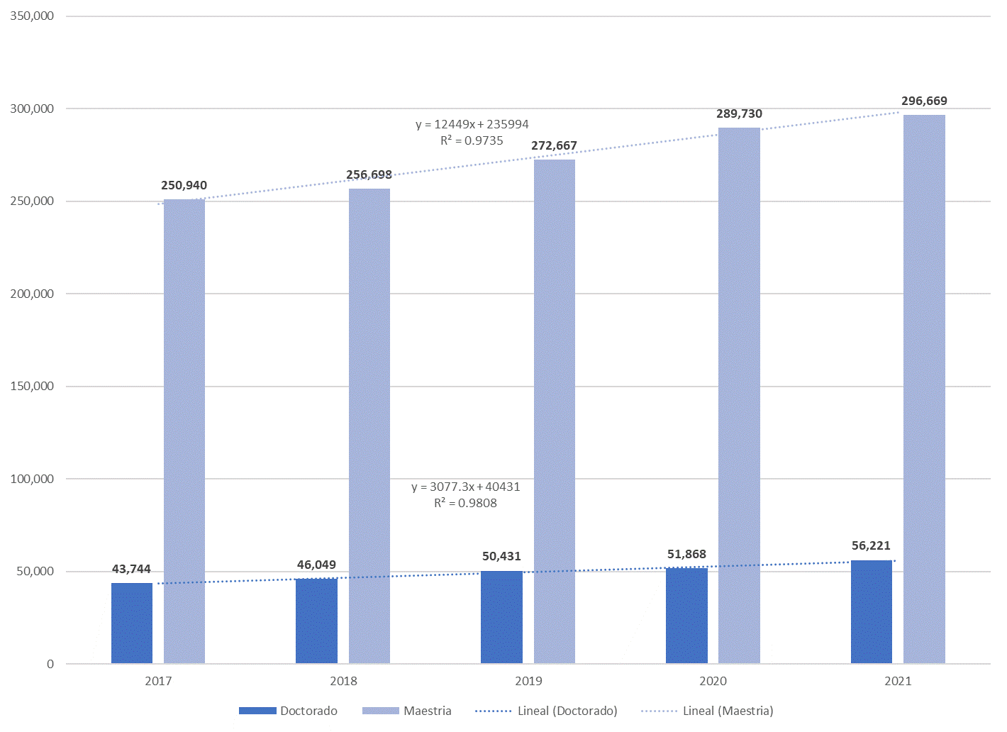 This paper analyzes the variation of enrollment in Mexico, at the master and doctoral level, in the private and public sector, covering the period 2017 to 2021. It addresses the origin of postgraduate degrees in Mexico and the requirements for obtaining the degree. With information obtained from ANUIES, in the Statistical Yearbooks of Higher Education, which allow us to have access to complete information on the public and private sectors at the postgraduate level, we identified the enrollment in the country and compared it with the enrollment of the period 1984-2000, studying the variation of the trend in this period and then the trend of the current period, 2017-2021. The 10 states with the highest enrollment in each of the levels, master's and doctorate, were identified. A trend analysis was performed using simple linear regression with the data on master's and doctoral enrollment, considering the variables of gender and the areas of training with the highest demand. which led to the conclusion that postgraduate enrollment in Mexico has experienced constant growth in recent years.