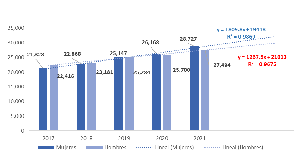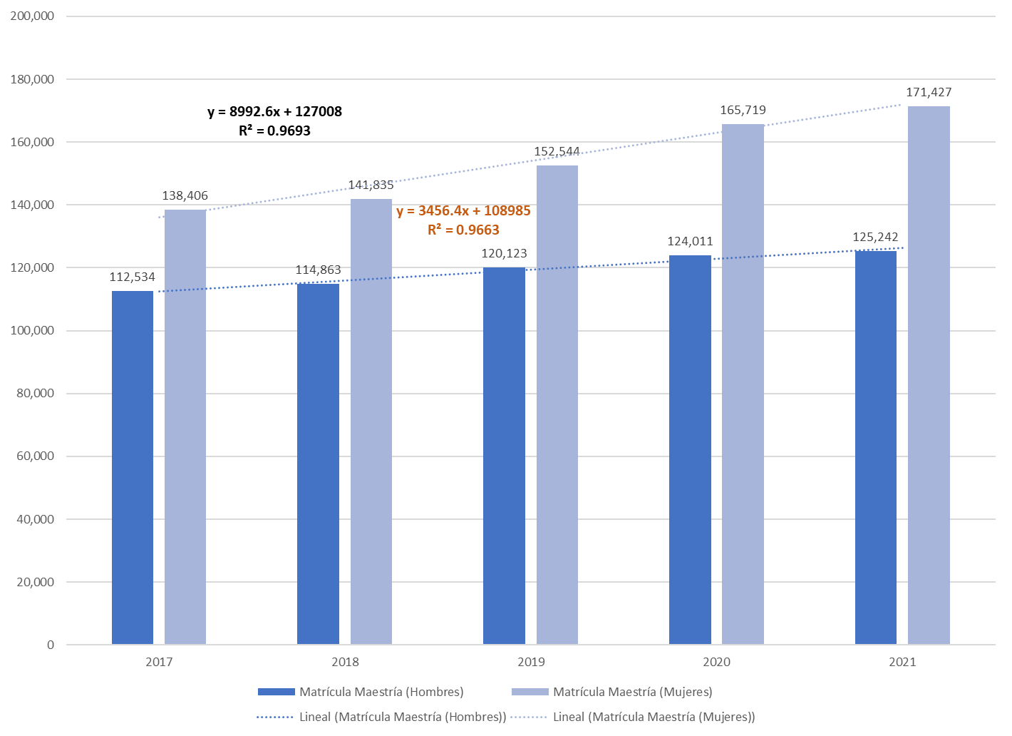 En el análisis de tendencia por regresión lineal simple considerando los datos de ingresos a la maestría diferenciados por género, en el periodo especificado, los resultados indican que tanto la matrícula de hombres como de mujeres ha crecido; la matrícula de hombres ha aumentado en 3,456 estudiantes y la de mujeres también ha aumentado en 8,992 estudiantes por año, durante el periodo de 2017 a 2021. Cabe destacar, que se observa una diferencia significativa en la cantidad de estudiantes matriculados en función del género, con una matrícula mucho mayor de mujeres en comparación con hombres.