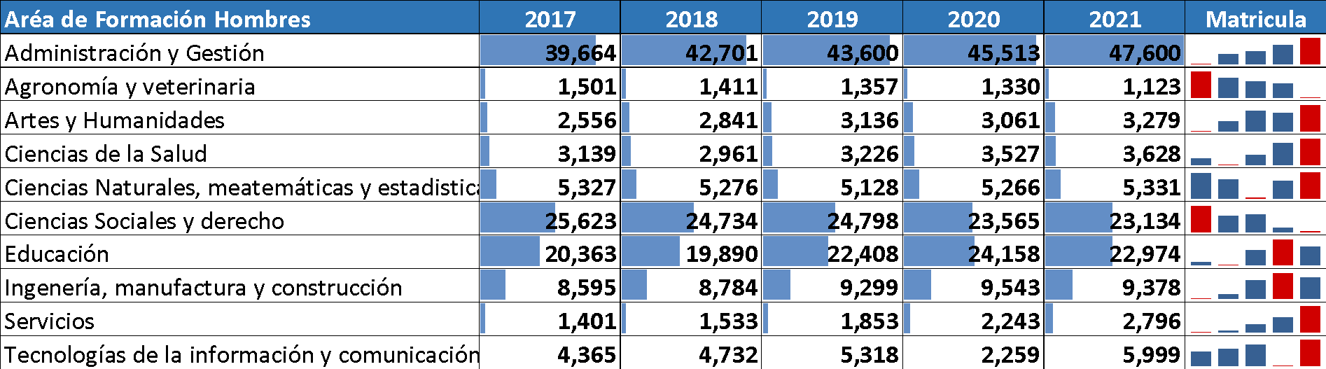 En la tabla 2, se puede visualizar la evolución de la matrícula de hombres a nivel maestría por área de formación, del 2017-2021. Los hombres optaron en matricularse en las siguientes Áreas de Formación: