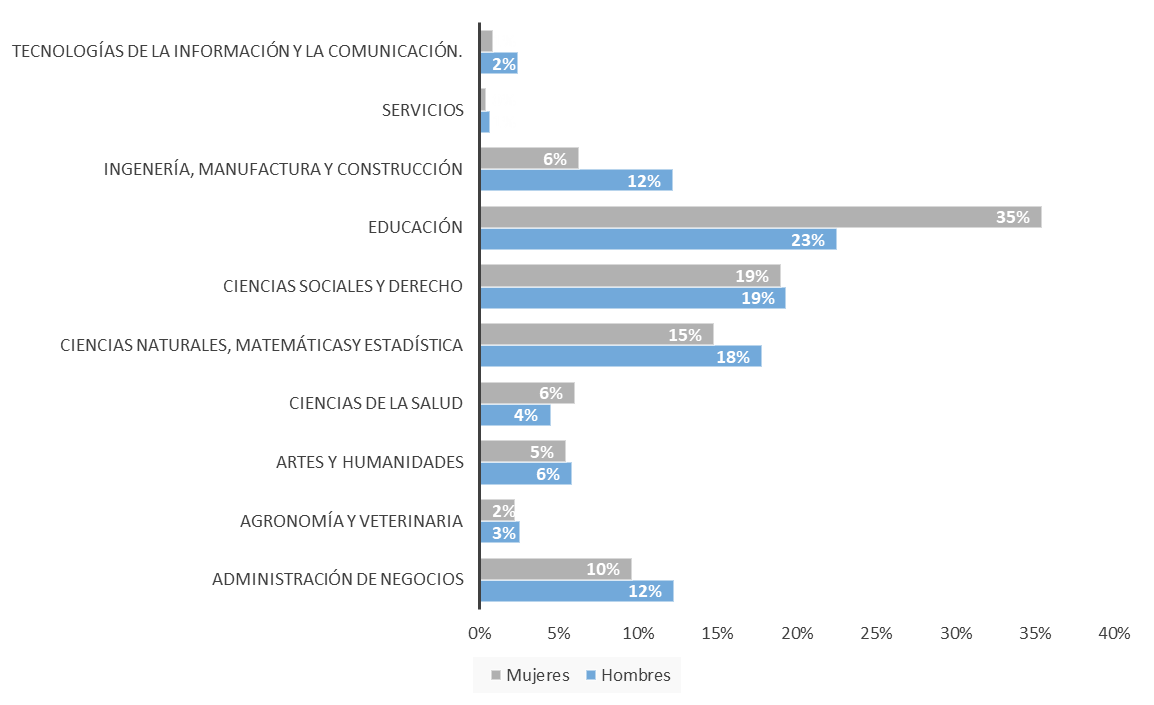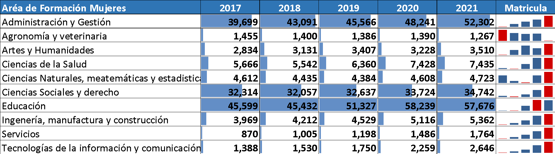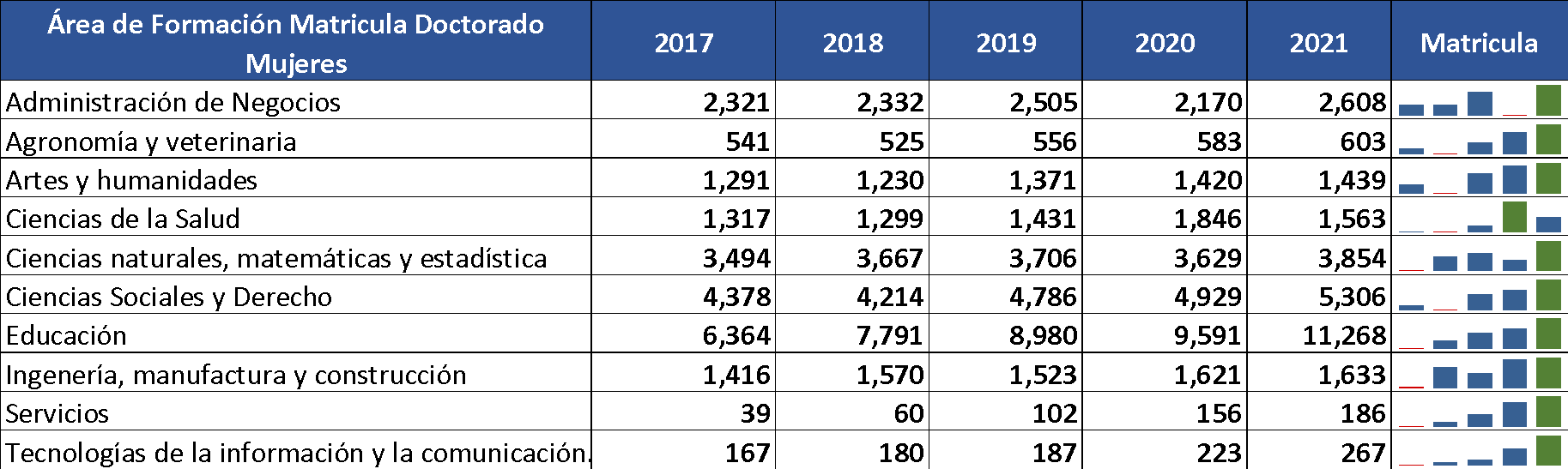 En el 2017-2021 las mujeres se matricularon a nivel doctorado de acuerdo a las siguientes áreas de formación: Administración de Negocios con el 10%, Agronomía y veterinaria 2%, Artes y humanidades 5%, Ciencias de la Salud 6%, Ciencias naturales, matemáticas y estadística 15%, Ciencias Sociales y Derecho 19%, Educación 35%, Ingeniería, manufactura y construcción 6%, Servicios 0%, Tecnologías de la información y la comunicación 1%.