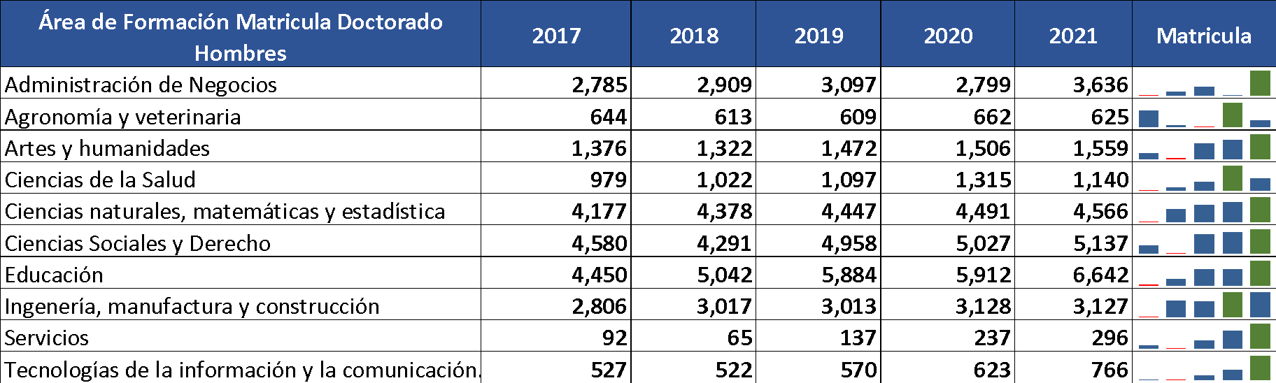 En síntesis, con los datos anteriores, puede señalarse que las áreas de formación a nivel doctorado que cuentan con mayor matrícula son en primer lugar, Educación, posteriormente en Ciencias Sociales y Derecho, seguido de Ciencias Naturales, Matemáticas y Estadística.