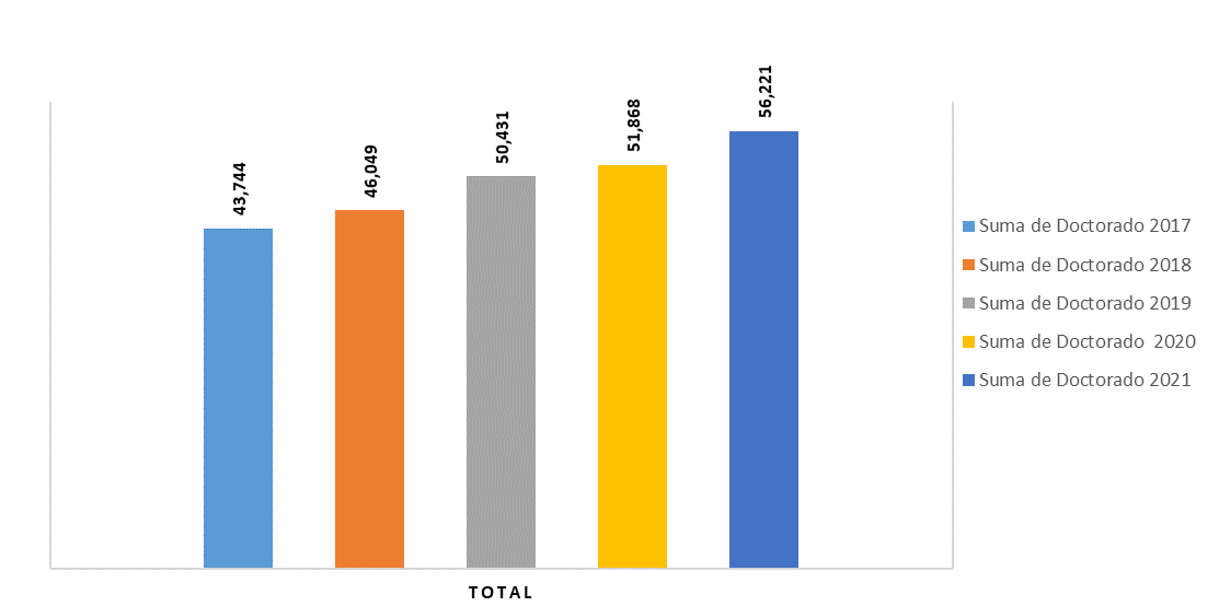 En la gráfica 4, se representa la matrícula a nivel Doctorado dentro del periodo del 2017-2021. En el 2017, se contaba con una matrícula a nivel federal de 43,744 matriculados, en el 2018 se tuvo un incremento de 2,305. Cabe destacar que del 2019 al 2020, solo hubo un incremento del 1,437, y en el periodo del 2020 al 2021, aun así, estando en pleno COVID-19, se tuvo un aumento de la matrícula con 4,353 más.