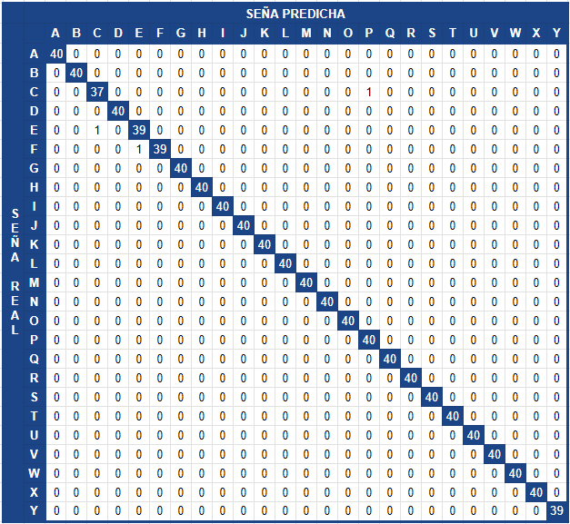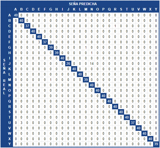 Las matrices confusión de las Figuras 5 y 6, resultaron al probar los clasificadores Random Forest y SVM, usando 25 clases con fotografías capturadas con las 2 manos, por lo tanto, cada clase cuenta con 200 fotos, es decir, 5000 imágenes totales; de las cuales 160 de las fotografías de cada clase se usaron para el entrenamiento y 40 para la validación. 15 imágenes de las 5000 no fueron detectadas con landmark, por lo tanto, en las matrices confusión de las Figuras 5 y 6, nuevamente algunos resultados de clasificación no presentan la acertación total de 40, ya que se tuvieron problemas en la detección de la mano y otras fueron clasificadas de forma incorrecta.