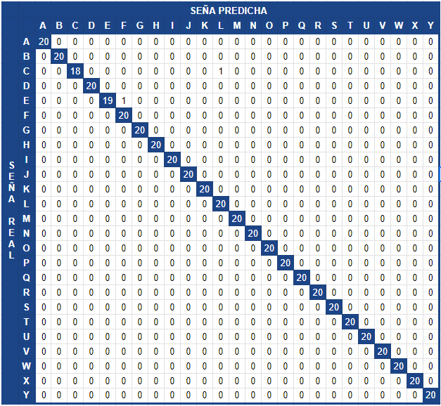 Las matrices confusión de las Figuras 3 y 4, se generaron con una base de datos propia de fotografías con una sola mano, para el entrenamiento se usaron 80 fotografías y 20 para la validación o reconocimiento. En total se tomaron 2500 fotografías, 100 para cada seña o clase, de las cuales 2493 se procesaron de forma correcta y 7 no fueron detectadas por landmark, de cada foto se obtuvieron vectores de dos dimensiones con 21 coordenadas [x-xmin, y-ymin]. En las matrices confusión, algunos resultados de clasificación no presentan la acertación total de 20, debido a los 7 problemas en la detección de la mano, los cuales quedaron distribuidos en las imágenes utilizadas en la fase de aprendizaje y reconocimiento; también se debe a imágenes que se clasificaron incorrectamente.